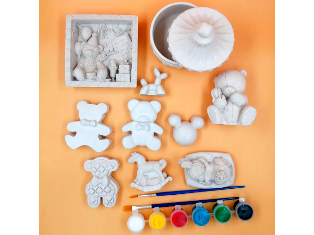 - Figuras: 4 osos, 1 cabeza de oso, 1 caballo, 1 perro de globo, 1 bebe, 1 joyero y 1 cuadro de oso